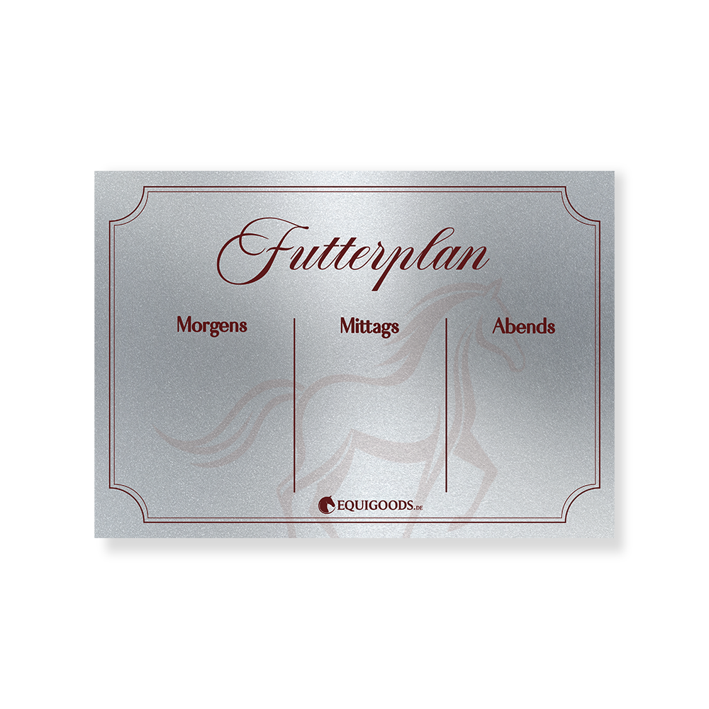 Unser Futterplan-Schild Silver aus Alu-Dibond verbindet edles Design mit hoher Funktionalität. Im klar strukturierten Layout lassen sich die Fütterungen für Morgens, Mittags und Abends übersichtlich eintragen – so hast du die tägliche Versorgung deines Pferdes stets im Blick.